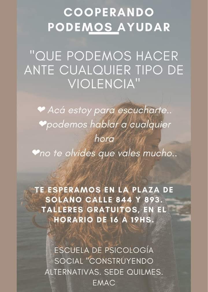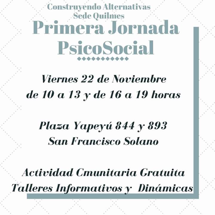 A partir de diversas practicas profesionales, un grupo de estudiantes avanzados de la Carrera de Psicología Social, Sede Quilmes de Construyendo Alternativas, evidenciaron diversas necesidades en la comunidad y decidieron canalizarlas a través de una Jornada Psicosocial, un espacio con l@s vecinos, un espacio para el encuentro.