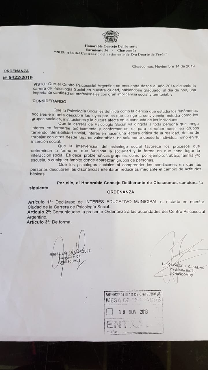 ❤El pasado jueves, el Consejo Deliberante de Chascomús, declaró de Interés Educativo Municipal a la Carrera de Psicología social, dictada por el Centro PsicoSocial Argentino en dicha localidad.