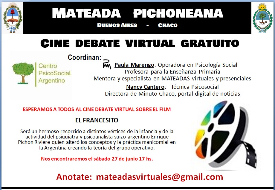 🍀 Te acercamos nuevamente, otra propuesta cultural que se va a realizar el día sábado 27 de Junio a las 17 hs de forma virtual, y de la cual podes participar “Mateada Pichoniana Bs. As – Chaco”. Organizada por la colega Paula Marengo Op. En Ps. Social (Prof. Para la Enseñanza Primaria) y mentora en mateadas virtuales, y quien les informa Directora de ❤minutochaco.com.ar y Técnica Sup. En Psicología Social Nancy Edith Cantero.