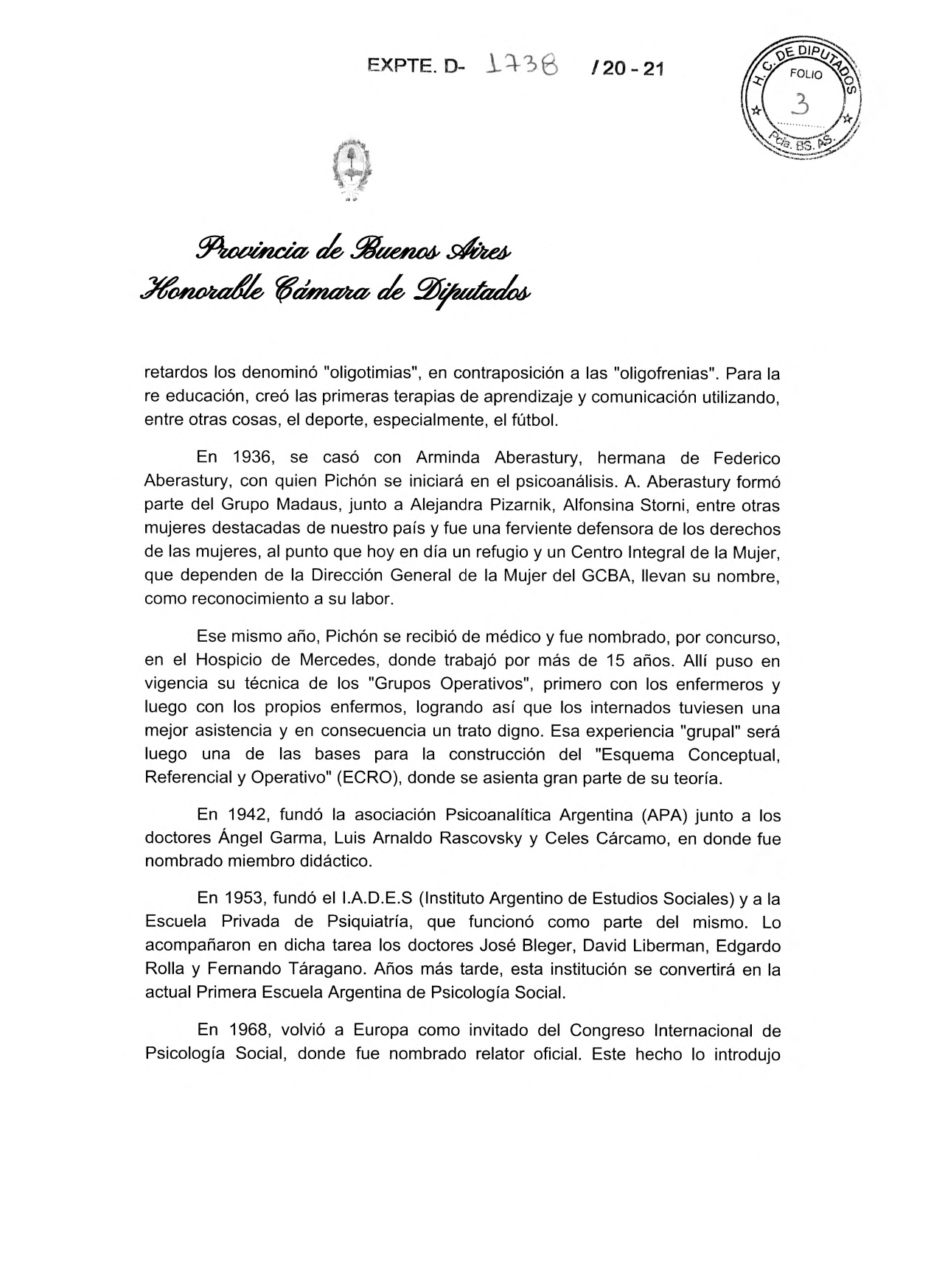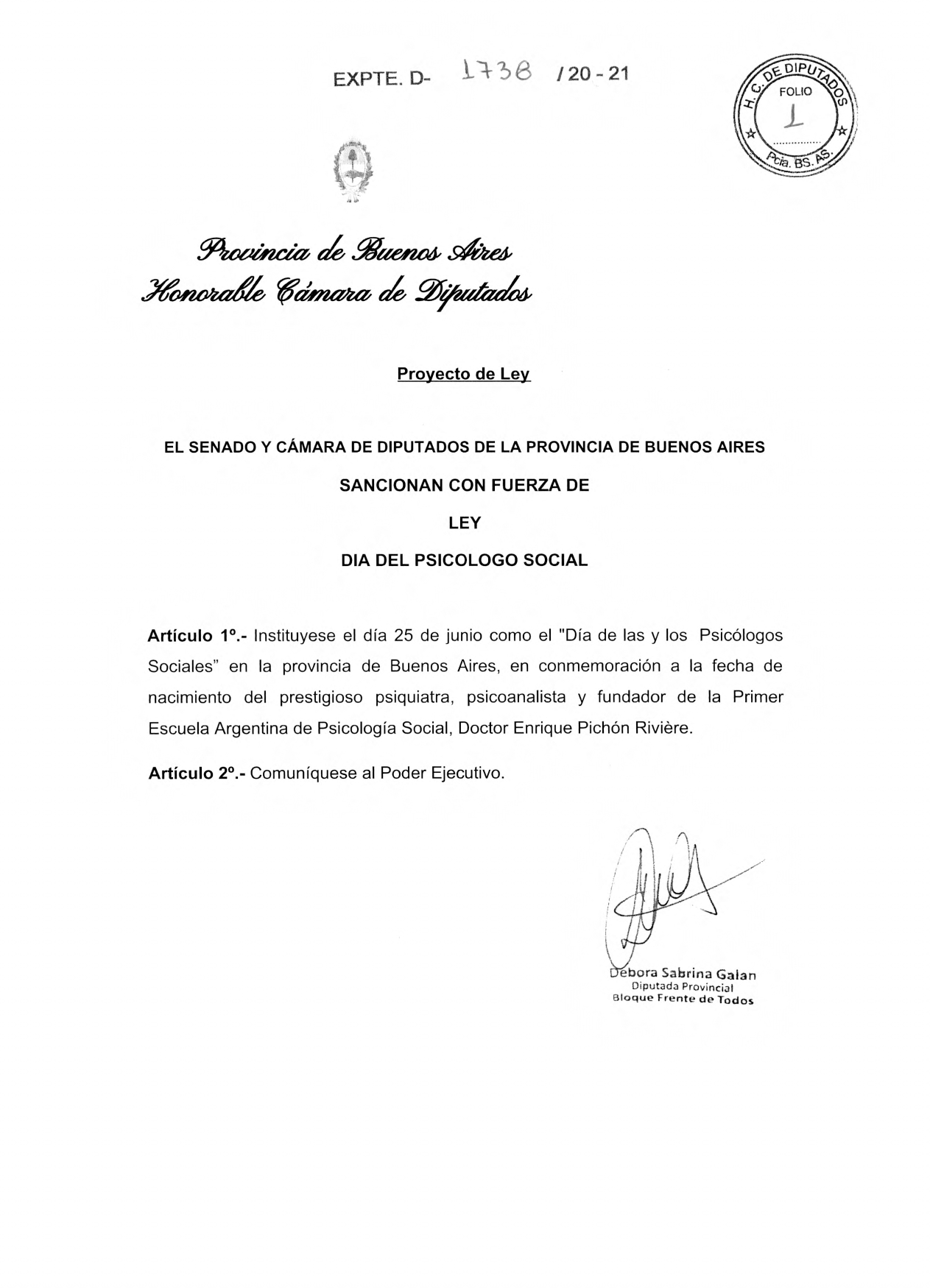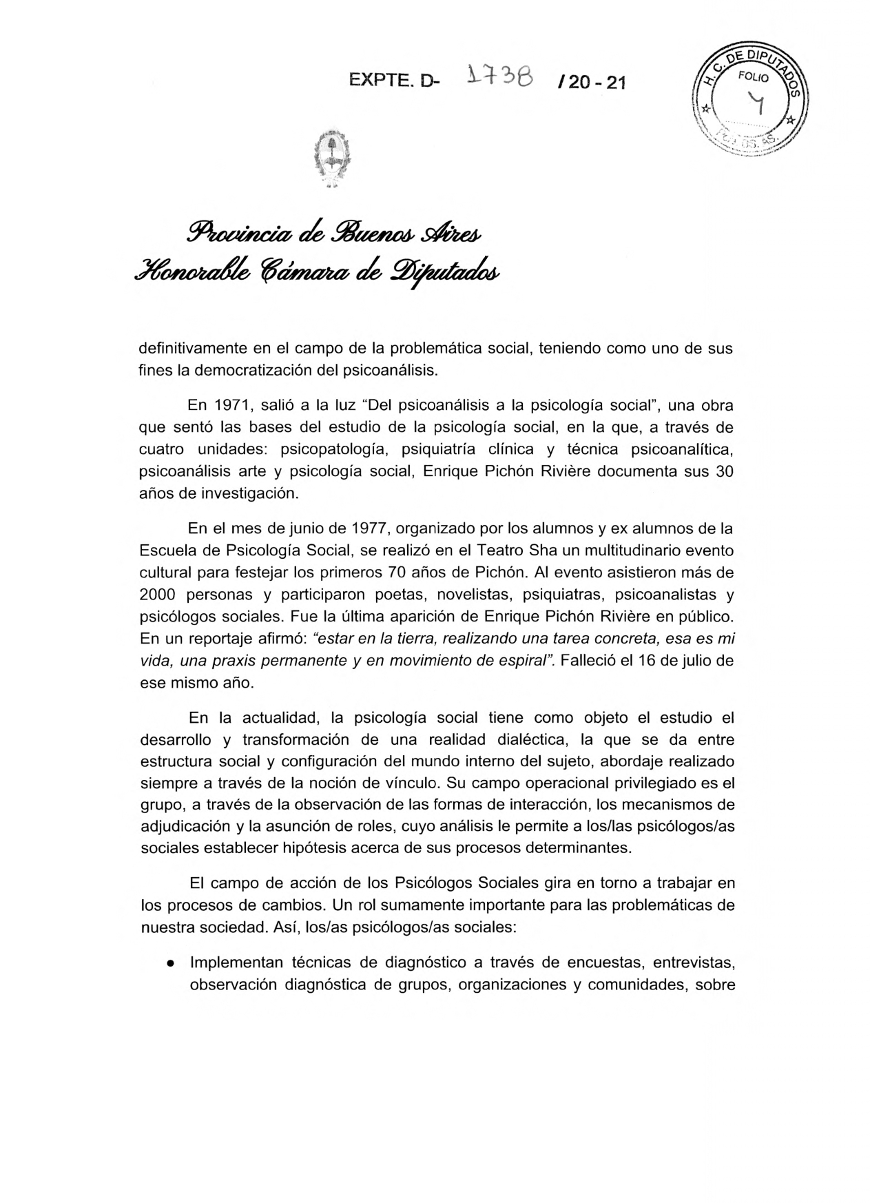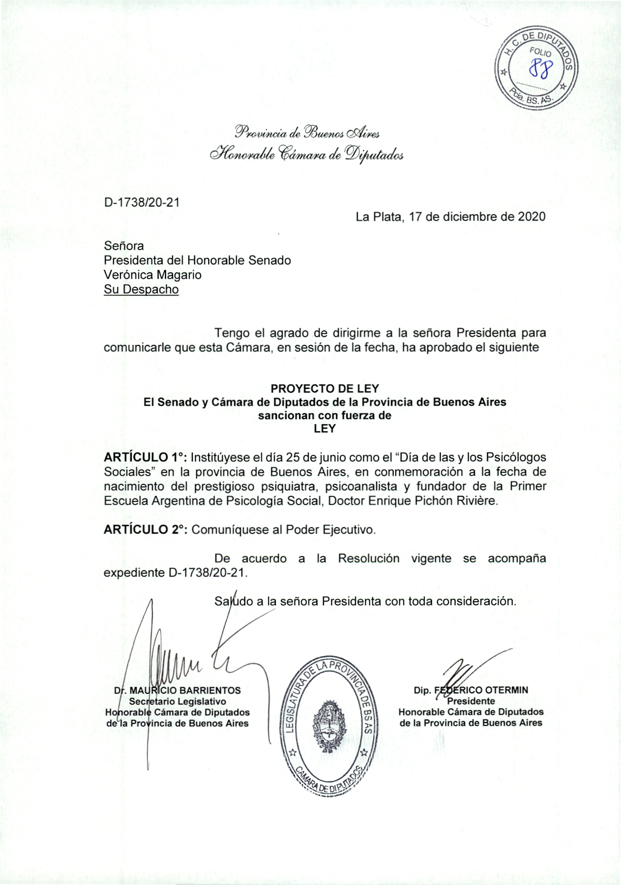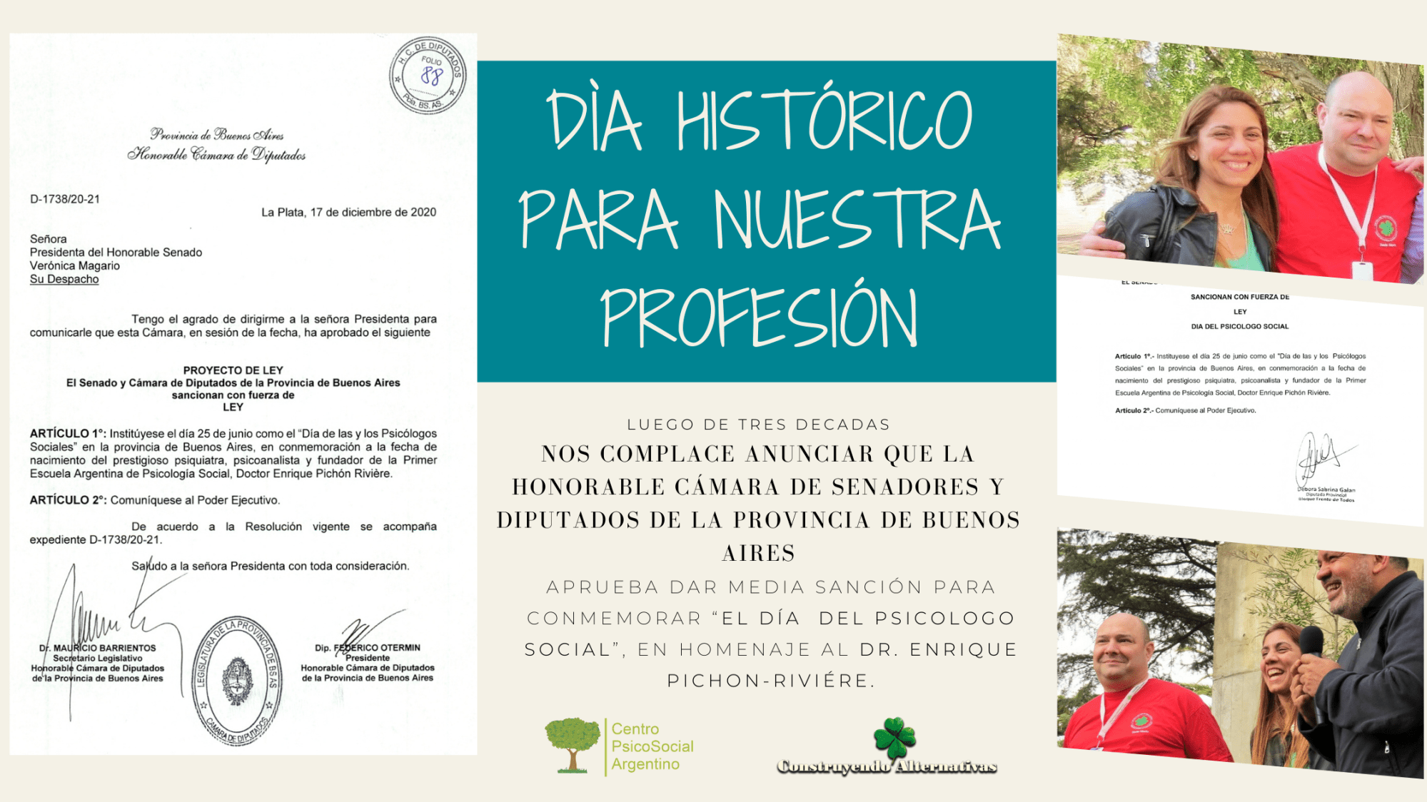 Luego de tres décadas, nos complace anunciar que La Honorable Cámara de Senadores y Diputados de la Provincia de Buenos Aires, aprueba dar media sanción para conmemorar “El Día  del Psicologo Social”, en homenaje al Dr. Enrique Pichon-Riviére.