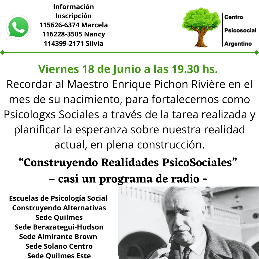 Recordar al Maestro Enrique Pichon Rivière en el mes de su nacimiento, Fortalecernos como Psicologxs Sociales a través de la tarea realizada y planificar la esperanza sobre nuestra realidad actual en plena construcción.