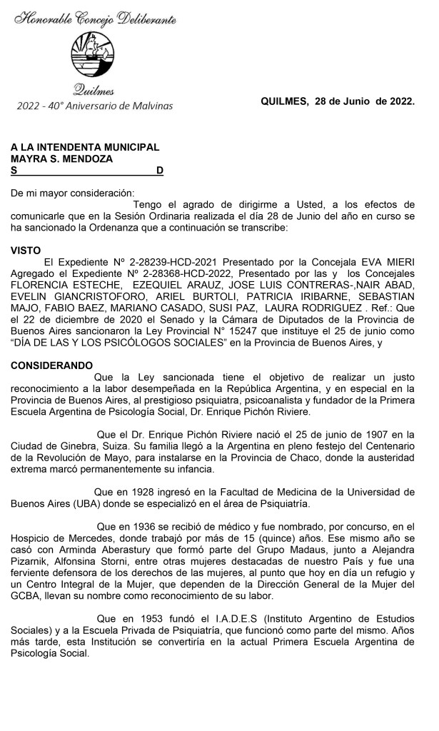 El pasado 28 de Junio por unanimidad el Honorable Consejo de Deliberante de QUILMES, quedo ratificado.