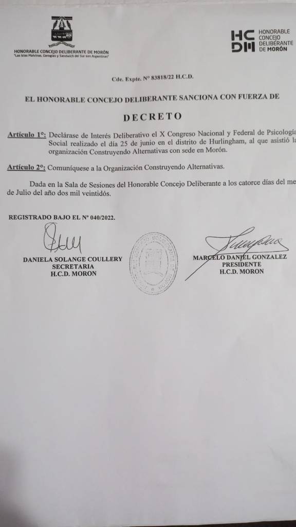 Declarar de interés deliberativo el X Congreso Psicosocial y Federal realizado el 25 de junio en el distrito de Hurlingham, al que asistió la organización Construyendo Alternativas Sedes Morón. Decreto 040 /2022.