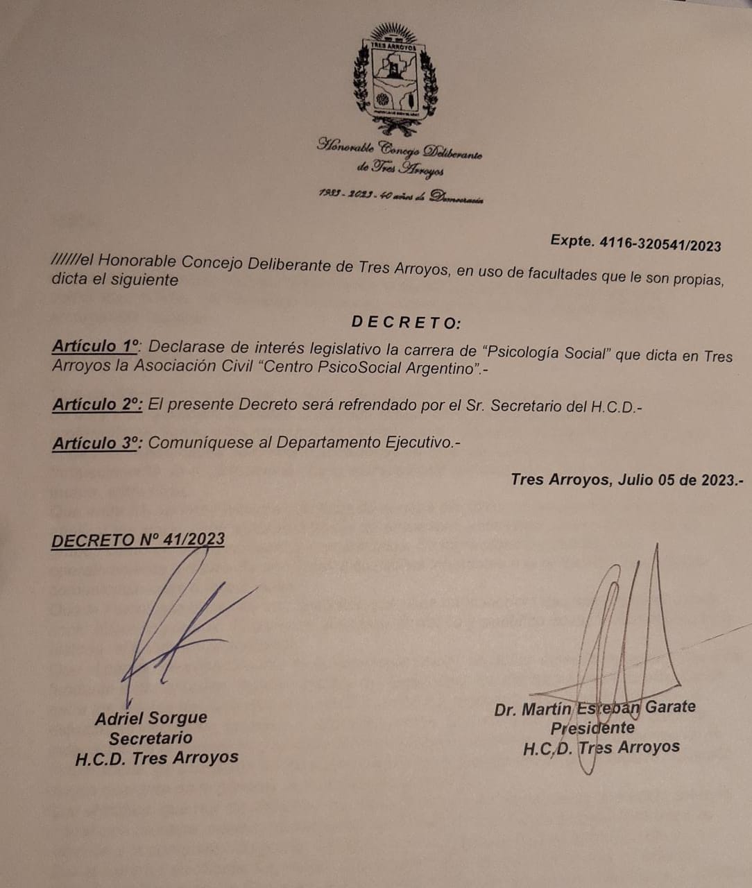 El pasado 5 de Julio, el Honorable Concejo Deliberante de Tres Arroyos y su Intendente a través del decreto 41/2023, han declararado de Interés Legislativo la Carrera de Psicología Social, dictada por el Centro PsicoSocial Argentino en dicha localidad.