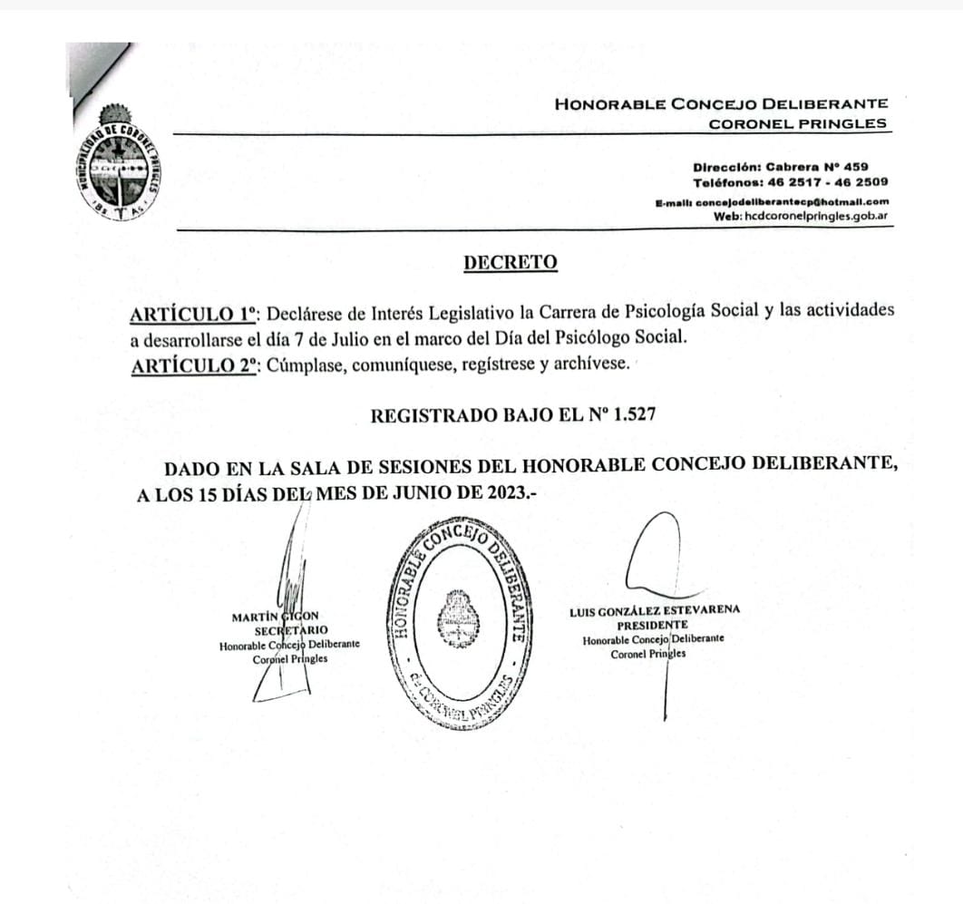 El pasado 15 de agosto por unanimidad el Honorable Concejo de Deliberante de Coronel Pringles declara de Interes Legislativo la carrera de Psicologia Social dictada por el Centro Psicosocial Argentino y las actividades desarrolladas en esa localidad desde nuestra Sede, conmemorando el 25 de Junio día del Psicólogo Social.