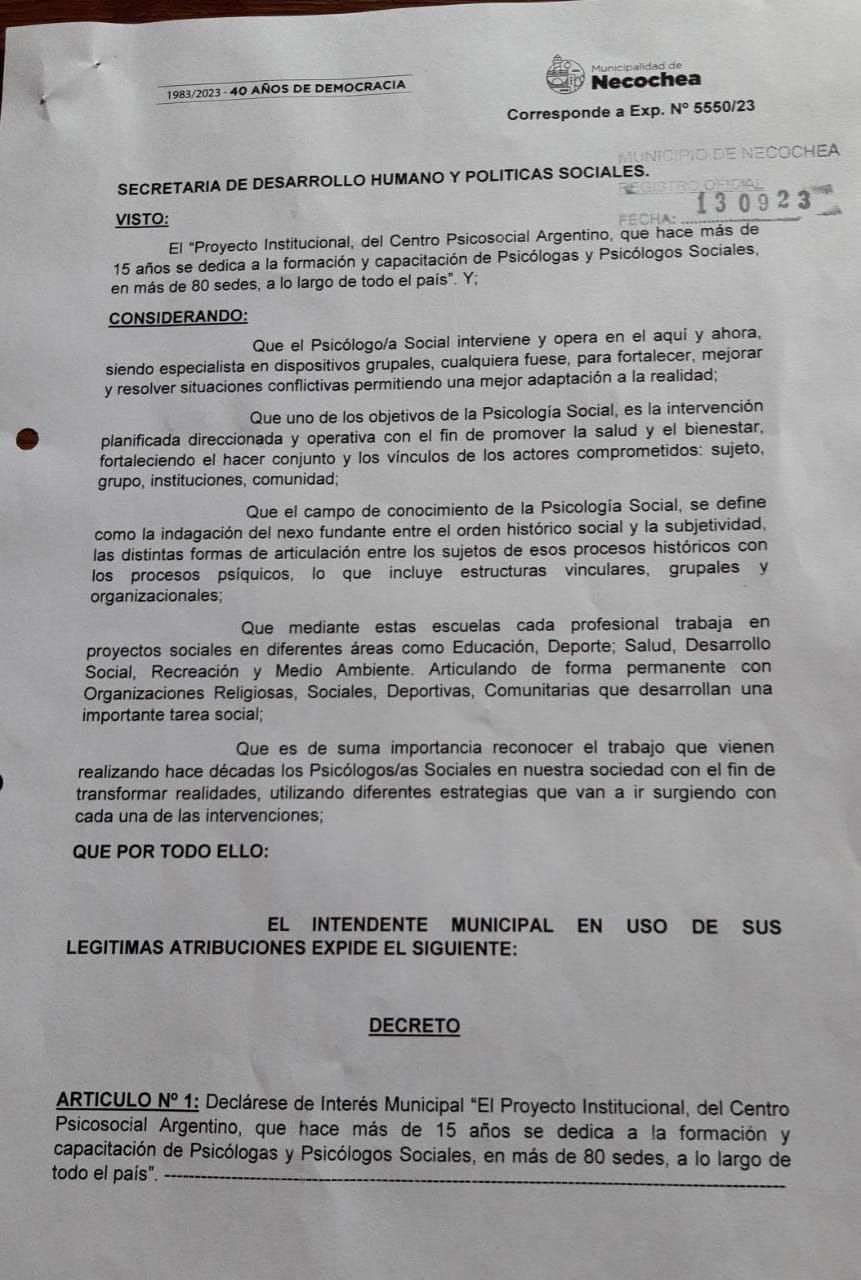 El pasado 13 de septiembre, el Intendente y La Secretaria de Desarrollo Humano y Politicas Sociales a través del decreto 5550/23, han declarado de Interés Municipal el Proyecto que lleva adelante el Centro PsicoSocial Argentino dictando la carrera de Psicologia Social en la ciudad de Necochea.