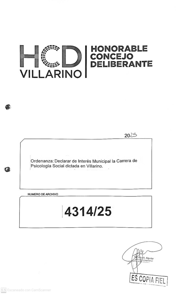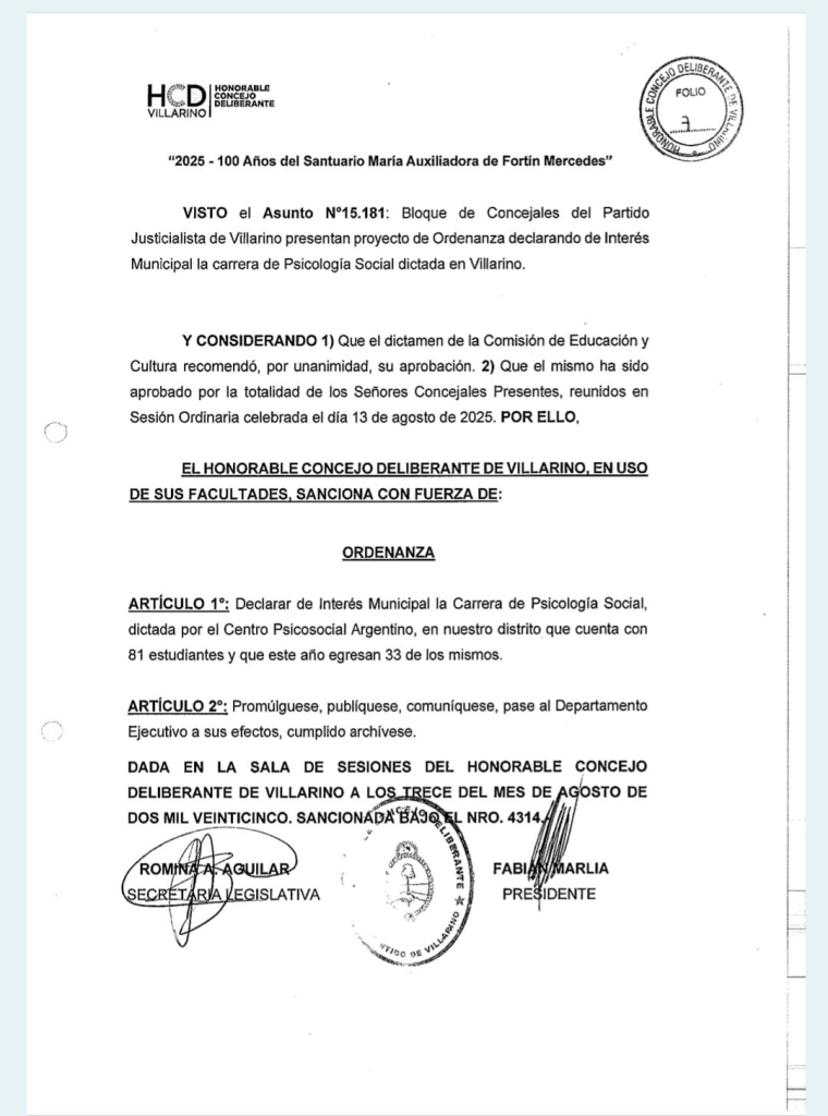 El pasado 13 de agosto por unanimidad el Honorable Concejo de Deliberante del Partido de Villarino declara de Interés municipal la carrera de Psicología Social dictada por el Centro PsicoSocial Argentino y las actividades desarrolladas en esa localidad desde nuestra Sede