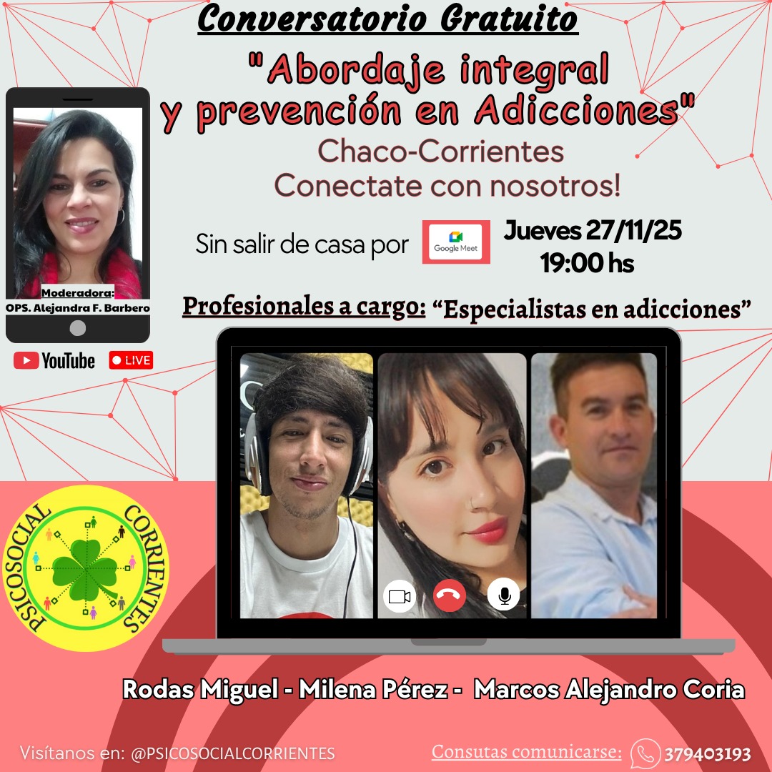 El Conversatorio será de manera virtual por plataforma Meet. El mismo quedará grabado por él canal de YouTube de Psicosocial Corrientes.
