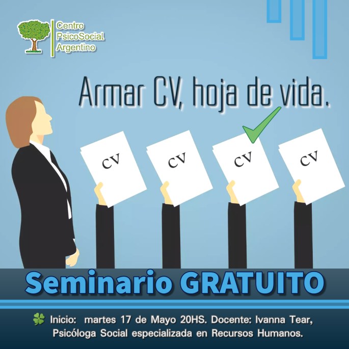 Seminario GRATUITO Como Armar una Hoja de Vida un C.V. Para Estudiantes, Psicólog@s Sociales, ATs, personal de Salud, ect. Inicio: 17 de mayo a las 20 hs – Virtual – Gratuito y de Calidad. ANOTATE AQUI : https://forms.gle/DZry1mBa5Lt3UVZY6 Docente: Ivanna Tear, Psicóloga Social especializada en Recursos Humanos. TEMARIO: Se explicará de manera sencilla y práctica como debenrealizar un Curriculum, que … Sigue leyendo SEMINARIO GRATUITO: ARMAR CV , HOJA DE VIDA.