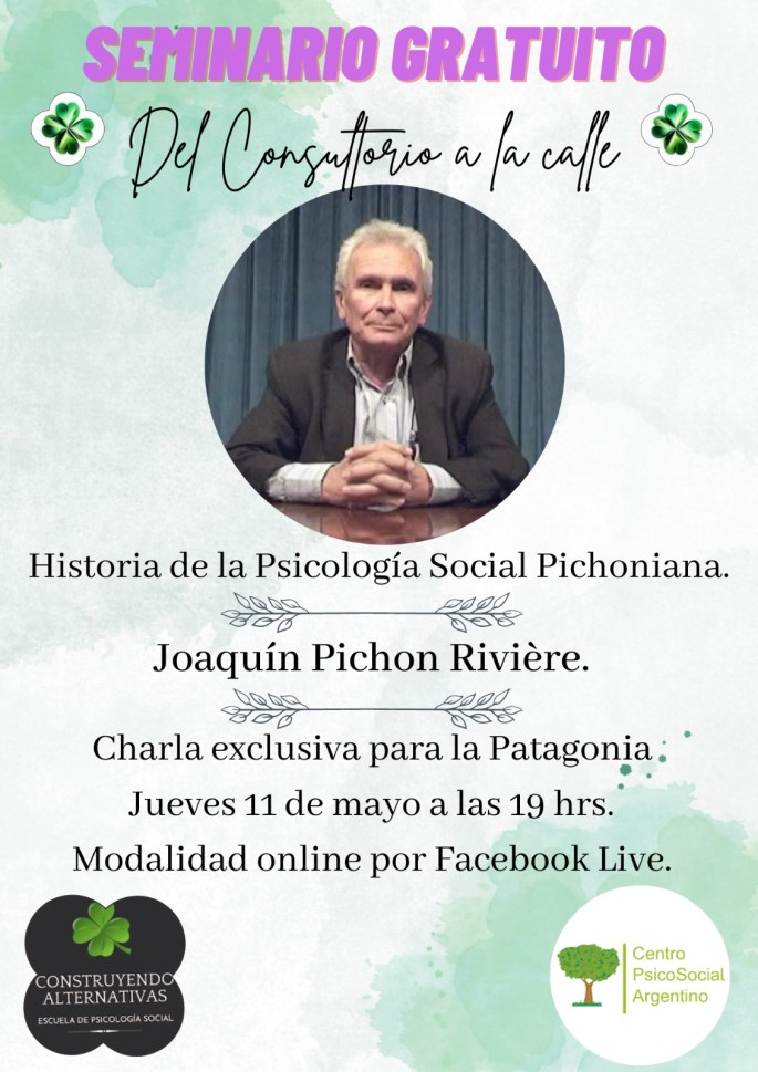 Joaquín Pichon- Riviere, de la Patagonia Argentina para todo Latinoamérica. Seminario GRATUITO, para los estudiantes, Colegas y Público en general. “Del Consultorio a la Calle.” El jueves 11 de mayo a las 19 hs. Para toda Argentina y Latinoamérica. Virtual y de Calidad Se Entrega Certificado Digital. ANOTE AQUÍ: https://forms.gle/mxLbZeN9Tv7qXzX59 Los esperamos a todos los … Sigue leyendo SEMINARIO GRATUITO: Del consultorio a la calle.