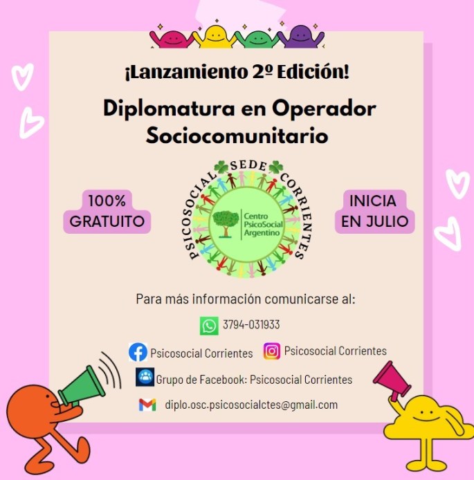2DA. EDICION. Diplomatura Federal: “en OPERADOR SOCIOCOMUNITARIO” Gratuita, Federal e Inclusiva, Tod@s. 2023 Es 100% virtual con Certificación Nacional Avalada por C.P.S.A y con Resolución de Interés 1269/21 Vice- Gobernación Provincia de Corrientes. INICIO: Sábado 8 de JULIO 2023,10 hs. Docentes: Psicólogas Sociales Silvana Escobar y Claudia Gil Desde la Provincia de Corrientes al País. La … Sigue leyendo DIPLOMATURA en OPERADOR SOCIOCOMUNITARIO.