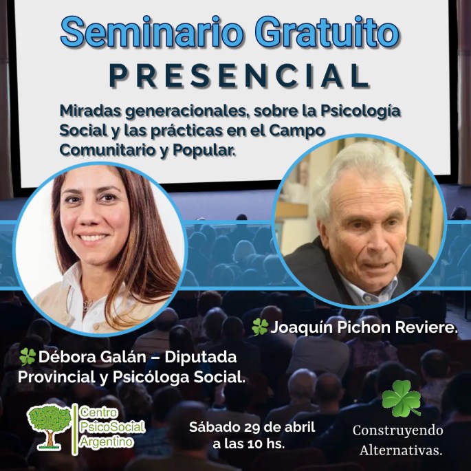 Seminario GRATUITO Presencial. “Miradas generacionales, sobre la Psicología Social y las prácticas en el Campo Comunitario y Popular”. Disertantes: Joaquín Pichon Reviere Débora Galán – Diputada Provincial y Psicóloga Social. Te esperamos el Sábado 29 de abril a las 10 hs. Dirección: Padre Luis Varvello 3959- Paso del Rey - Moreno Temario: Psicología social atravesada … Sigue leyendo SEMINARIO GRATUITO PRESENCIAL.