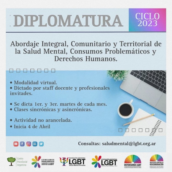 La Federacion Argentina LGBT+ y el Centro PsicoSocial Argentino. Diplomatura Nacional, gratuital Virtual y de Calidad. Tenemos el agrado de invitarles a la III edición de nuestra Diplomatura en Abordaje Integral, Comunitario y Territorial de la Salud Mental, Consumos Problemáticos y DDHH.. Una propuesta de formación integral, no arancelada, virtual, comprometida, inclusiva y federal para … Sigue leyendo DIPLOMATURA ABORDAJE INTEGRAL.
