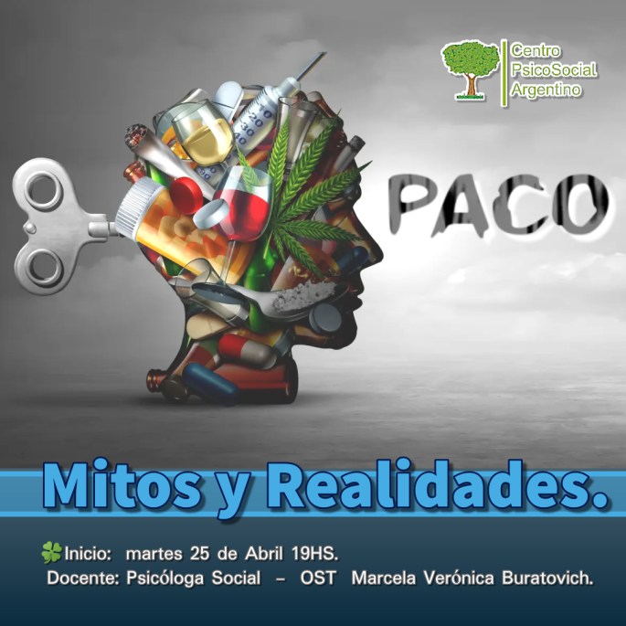 Seminario GRATUITO sobre PACO Mitos y Realidades - Inicio: martes 25 de Abril 19 hs. Docente: Psicóloga Social - OST Marcela Verónica Buratovich. para , Psicólogos Sociales, Docentes, Acompañantes Terapéuticos, Psicólogos, y otras carreras de salud y educación; para estudiantes de estas áreas; y personas interesadas. ANOTATE AQUÍ: https://docs.google.com/forms/d/e/1FAIpQLSflA-s9n-Vw6v8QnRxaUNq6fbofpux2MZPBMjUD62DLFqWKwQ/viewform?usp=sf_link Se entrega Certificado Digital. Los invitamos a participar … Sigue leyendo SEMINARIO GRATUITO: PACO, mitos y realidades.