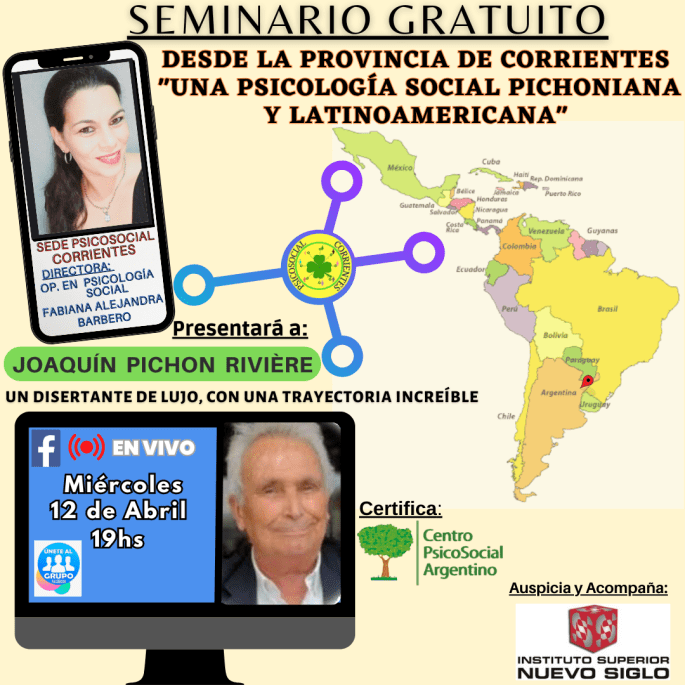 Seminario GRATUITO, Estudiantes y Psicolog@s Sociales Desde la Provincia de Corrientes “Una Psicología Social Pichoniana y Latinoamericana” Disertante: Joaquín Pichon Rivière Coordinadora: Alejandra F. Barbero Fecha: Miércoles 12 de Abril a las 19:00hs. Se Entrega certificado Digital. inscripción aquí: https://docs.google.com/forms/d/144h0FsON2lfD3gZcD6QMOyJ4NI5ARsUL4xBxhr7oNmI/edit?usp=drivesdk Ejes Temáticos: 1)- La Importancia de la Psicología Social. 2)- Cómo podemos ayudar con esta disciplina, a entender … Sigue leyendo SEMINARIO GRATUITO: PSICOLOGIA SOCIAL LATINOAMERICANA.