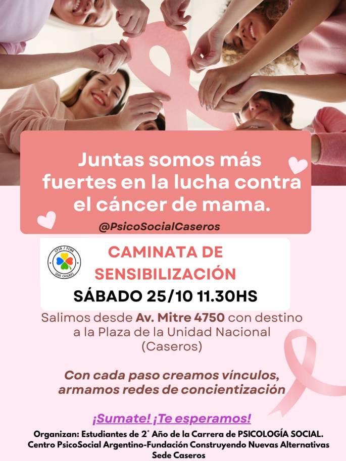 CAMINATA LUCHA CONTRA EL CÁNCER DE MAMA Con motivo de la LUCHA CONTRA EL CÁNCER DE MAMA, realizaremos una CAMINATA para crear conciencia y promover: la detección temprana, el diagnóstico y el tratamiento oportuno de esta enfermedad. La CAMINATA la realizaremos el SÁBADO 25/10, a partir de las 11:30hs Nos reuniremos en la Puerta de la … Sigue leyendo CAMINATA DE SENSIBILIZACION : Cáncer de Mama