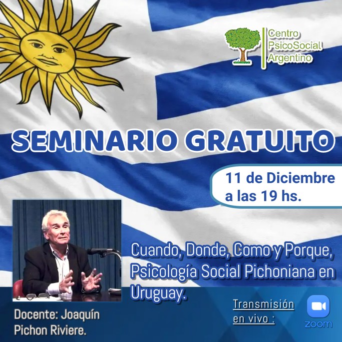 Seminario GRATUITO Estudiantes, Psicólogos Sociales, y Público en General. “Cuando, Donde, Como y Porque, Psicología Social Pichoniana en Uruguay.” Inicio: 11 de Diciembre a las 19 hs. Docente: Joaquín Pichon Riviere. Anótate AQUÍ: https://forms.gle/EXke6Y3NeK9igKQr7 Se transmite por Zoom Premium. (una vez anotado). Anótate AQUÍ: WhatsApp 092-607-032. Se Entrega Certificado Digital. Ejes temáticos : Enrique Pichon Riviere y … Sigue leyendo SEMINARIO GRATUITO
