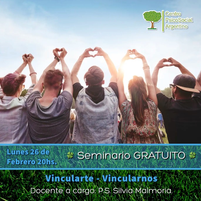 Seminario GRATUITO Estudiantes, Psicólogos Sociales, y Público en General. Vincularte- Vincularnos, Una mirada psicosocial Inicio: Lunes 26 de febrero 20hs. Docente: P.S. Silvia Malmoria. Se Entrega Certificados Digital. Virtual- Gratuito y de Calidad. INSCRIBITE AQUI: https://forms.gle/Xpk82CwYB8DGFfC59 Temario *Concepto de Vínculo *Alcances en el entramado Social *Vínculos de apego * Herramientas de Intervención Seguimos Trabajando junt@s … Sigue leyendo SEMINARIO GRATUITO: VINCULARTE – VINCULARNOS, una mirada Psicosocial.