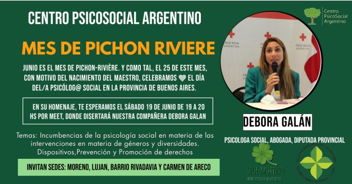 ❤El Desarrollo de un rol Profesional del Psicólogo Social. 🍀 Inicio: sábado 19 de Junio de 19 a 20 Hs ❤Expositora: Débora Galán- Diputada Provincial- Abogada y Psicóloga Social. 🍀 Anótate Aquí: psicosocialmoreno@gmail.com 🍀 Durante junio, mes de homenajes a nuestro Dr. Enrique Pichón Riviere, desde las Sedes de Construyendo Alternativas los invitamos a compartir pensamientos, sensibilidades, recursos heterogéneos, incumbencias que … Sigue leyendo ❤Seminario Gratuito, para tod@s los Trabajadores Psicologia Social y Estudiantes.