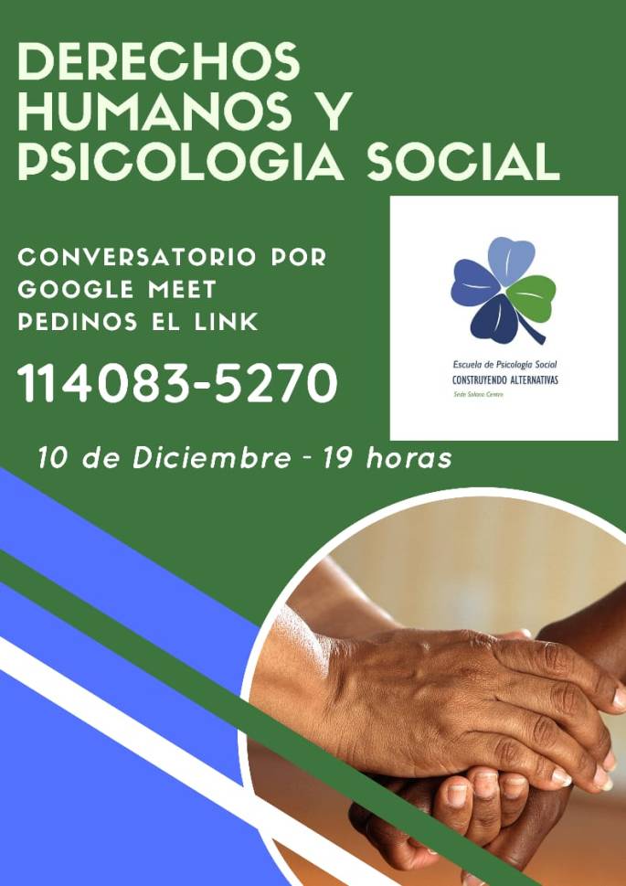 Este Jueves 10 de Diciembre a las 19 horas estaremos llevando adelante un conversatorio sobre "Derechos Humanos y Psicología Social", nos acompañan Ps.Soc. María Itati Gomez, Ps.Soc. Laura Ojeda y el Ps. Social Ruben Amato.. Actividad Abierta y Gratuita a través de Google Meet en https://meet.google.com/zva-efaj-nwf Para todo público interesado en conocer las acciones psicosociales … Sigue leyendo Conversatorio «Derechos Humanos y Psicología Social»