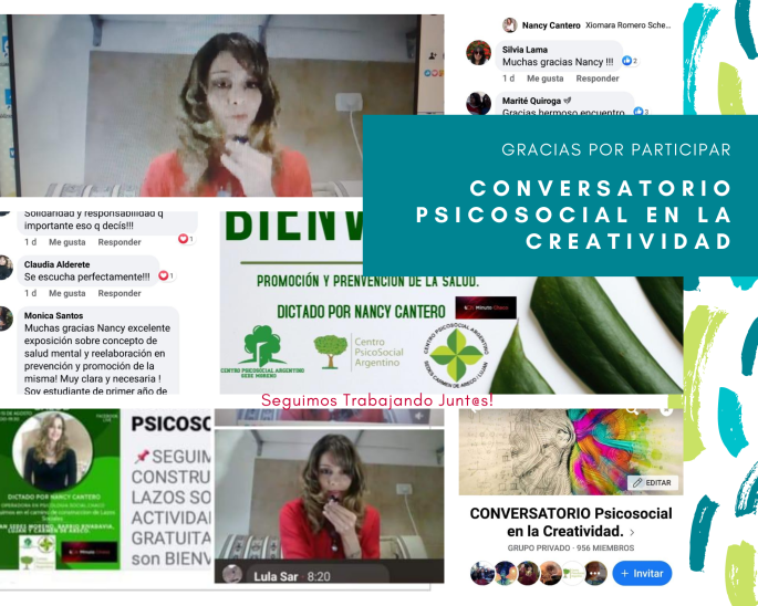 ❤Gracias y Felicitaciones, a los 953 Estudiantes y Trabajadores de la Psicología Social. Por participar en el Conversatorio Psicosocial en la Creatividad, el pasado sábado 15 de agosto. 🍀Gracias Nancy Cantero que, desde la Provincia de Chaco a toda Argentina y países hermanos de Latinoamérica, dicto el encuentro. Compartimos un sábado con herramientas, y nuevas … Sigue leyendo Masiva participación en el Conversatorio Psicosocial en la Creatividad