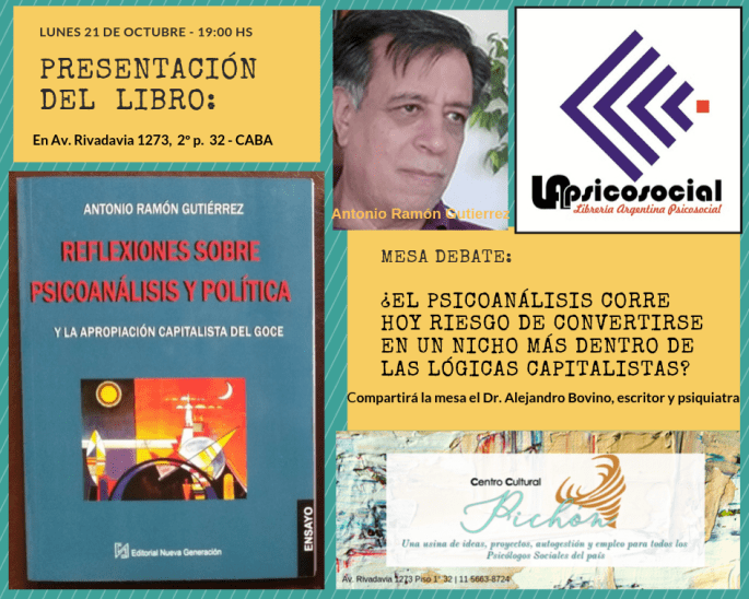 Crees que la política es cosa de psicoanálisis? O viceversa? Para debatir sobre ello y sus implicancias mutuas, te invitamos a la presentación del libro "Reflexiones sobre psicoanálisis y política" Este lunes 21 de Octubre a las 19:00 hs. en el Centro Cultural Pichon (Av. Rivadavia 1273, 2 piso, of. 32, CABA). Contaremos con la … Sigue leyendo Crees que la política es cosa de psicoanálisis?