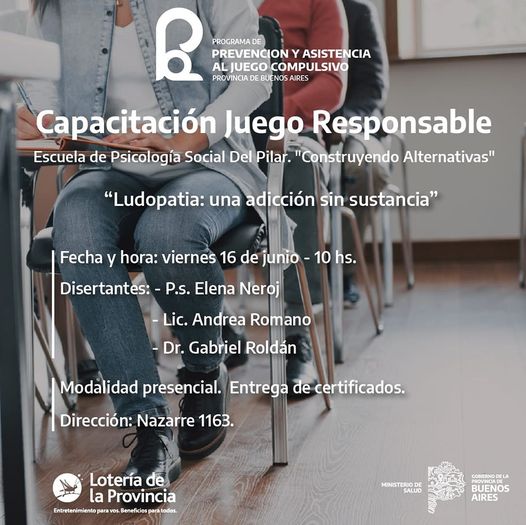 LUDOPATIA desde una Mirada Psicosocial. Lotería de la Provincia de Buenos Aires y Las Escuelas “Construyendo Alternativas” Capacitación GRATUITA Juego Responsable“Ludopatía: Una adicción sin sustancias” Fecha y hora: viernes 16 de junio - 10hsDisertantes -P.s. Elena Neroj -Lic. Andrea Romano … Sigue leyendo CAPACITACION JUEGO RESPONSABLE.