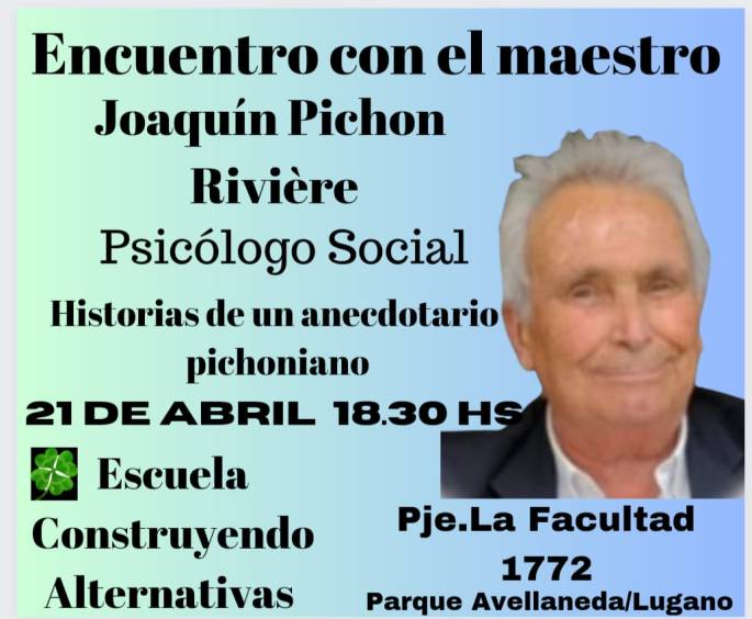 Encuentro con Joaquín Pichon Rivière. Te esperamos el 21 de abril 18.30 hs. Para compartir "Historias de un anecdotario Pichoniano" En Sede Pque. Avellaneda Pje. la Facultad 1772. Esq. Eva Perón - CABA. ACTIVIDAD GRATUITA. Te acercan las siguientes líneas: 7- 46- 47- 50 - 56 - 97- 103-145 subte línea Estación Virreyes. … Sigue leyendo Encuentro con Joaquín Pichon Rivière.