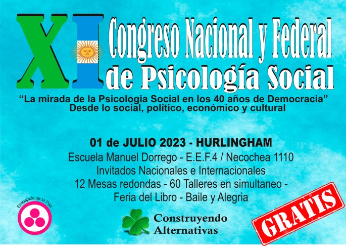 XI CONGRESO Nacional y Federal de Psicologia Social "La mirada de la Psicología Social en los 40 años de Democracia" Desde lo Social, Político, Económico,DDHH y Cultural" La verdadera lucha es acá, con trabajo genuino Tod@s los Psicólog@s Sociales y Estudiantes serán bienvenidosActividad GRATUITA 01 de Julio 2023 en HURLINGHAM Esc. Manuel Dorrego - E.E.F. … Sigue leyendo XI CONGRESO NACIONAL Y FEDERAL DE PSICOLOGIA SOCIAL.