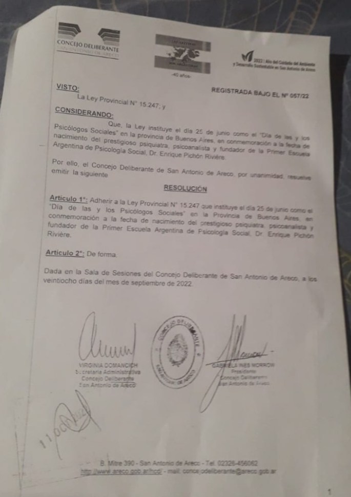 En San Antonio de ARECO la Psicología Social también es Reconocida. Con Emoción y Alegría, anunciamos otro Gran logro para la Psicología Social ahora en San Antonio de ARECO. El pasado 11 de OCTUBRE por unanimidad el Honorable Consejo de Deliberante de San Antonio de ARECO, quedo ratificado. el 25 de Junio día del Psicólog@ Social. Reconocimiento … Sigue leyendo ARECO ES PSICOSOCIAL.
