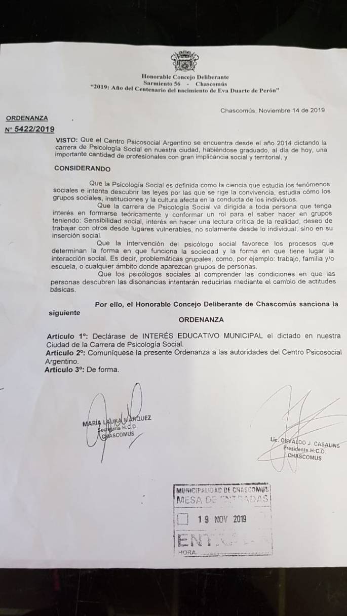 ❤Emoción y Alegría compartimos una noticia que es un logro para los Trabajadores de la Psicólog@s Social. ❤ ❤El pasado jueves, el Consejo Deliberante de Chascomús, declaró de Interés Educativo Municipal a la Carrera de Psicología social, dictada por el Centro PsicoSocial Argentino en dicha localidad. Logrando que, de los 135 municipios, 16 municipios ya nos … Sigue leyendo Chascomus es Psicología Social, Comunitaria, Solidaria, Popular y con Diversidad