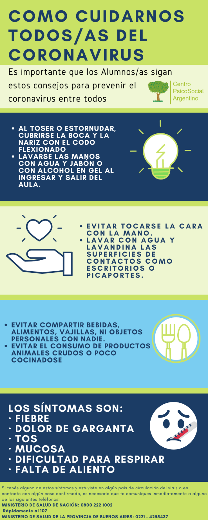 Ministerio de Salud de la Nación y Centro PsicoSocial Argentino Es importante que los Alumnos/as sigan estos consejos para prevenir el coronavirus entre todos: · Al toser o estornudar, cubrirse la boca y la nariz con el codo flexionado. · Lavarse las manos con agua y jabón o con alcohol en gel al ingresar y … Sigue leyendo Cómo Cuidarnos TODOS/AS del CORONAVIRUS