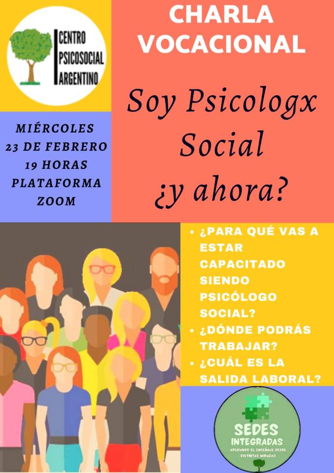 Charla Vocacional – GRATUITA, Para todo@s los Psicolog@s Sociales Tema: Soy Psicólogo Social, y ahora? Inicio: Miércoles 23 de febrero a las 19 horas. INSCRIBITE COMPLETANDO EL SIGUIENTE FORMULARIO: https://forms.gle/ndecEnhR6bAJ3cX98 Temas Abordaje de un Psicólogo Social. Cuál es tu salida laboral, dónde podrías trabajar. Como Emprender y ser Rentable. Encuentro a cargo de la P.S. María … Sigue leyendo CHARLA VOCACIONAL GRATUITA