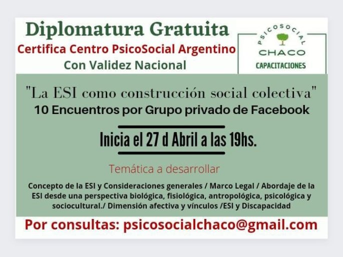 Diplomatura Gratuita para tod@s los Trabajadores de la Psicología Social, y Personal de Educación, del País. "La ESI como construcción social colectiva" Inicia el 27 de Abril a las 19 hs. 10 Encuentros Por Grupo Privado de Facebook Profesora Laura Ordoqui Se entrega Certificado Digital. ANOTATE AQUI: https://forms.gle/mPghfy3hn5Knuev99 TEMARIO: Concepto y Conceptualizaciones generales Marco Legal … Sigue leyendo DIPLOMATURA GRATUITA: ESI
