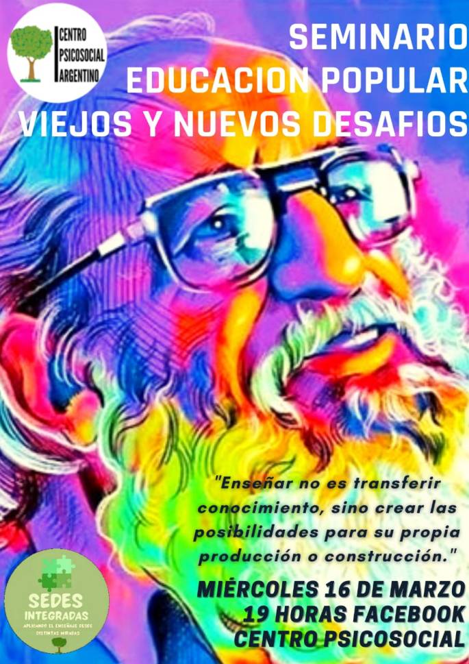 Seminario GRATUITO, para Estudiantes y Psicolog@s Sociales Viejos y Nuevos desafíos en la Educación Popular. Inicio 16 de marzo 19 has. ANOTE AQUÍ: https://forms.gle/a3VM939sDwTeEqU17 Docente a cargo: PS María Belen Rivero Temario: *Fundamentos de la concepción política-pedagogicas de Paulo Freire en los proyectos y programas socio-comunitarios. *Propuestas y enfoques en el campo de la Educación … Sigue leyendo SEMINARIO EDUCACION POPULAR