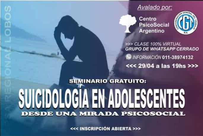 Seminario Gratuito: SUICIDIOLOGÍA en adolescentes desde una mirada Psicosocial GRATUITO, VIRTUAL y de CALIDAD para todos/as los Psicólogos Sociales, Estudiantes y público en General. Fecha: Viernes 29 de Abril a las 19 hs. Dictado por la Prof. Arroyo Wesner Maria. Al completar el formulario te estas inscribiendo al Inscripción: https://forms.gle/E8ktJMpWeaj5fvMJ6 Se Entrega Certificado Digital. Durante … Sigue leyendo SEMINARIO GRATUITO: SUICIDOLOGIA EN ADOLESCENTES