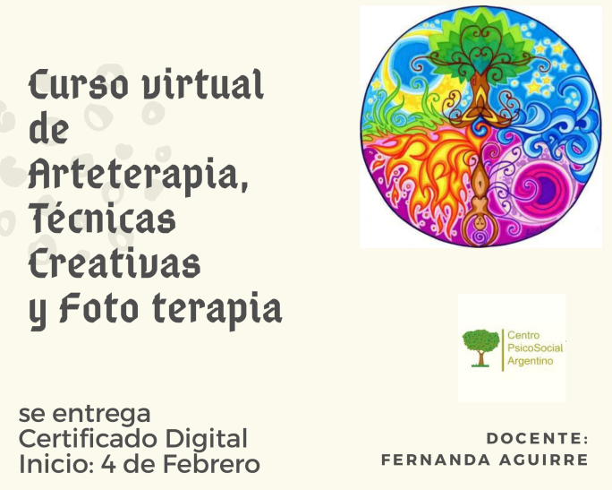 (Orientado al trabajo en Grupo y con Pacientes con patologías) 🍀Cursada: 10 clases con un Examen Integrador. 🍀Inicio: Jueves 4 de Febrero. Todo virtual a través de Plataformas. Docente Fernanda Aguirre. 🍀Se Entrega Certificado Digital. Costo: dos pagos de $1450- https://mpago.la/12wy4kf o un solo Pago de $2350- https://mpago.la/16mZjyL Objetivos 🍀Las Fotos, la Creatividad y el Arte, involucra … Sigue leyendo Curso Virtual de Arte Terapia, Técnicas Creativas y Fototerapia.