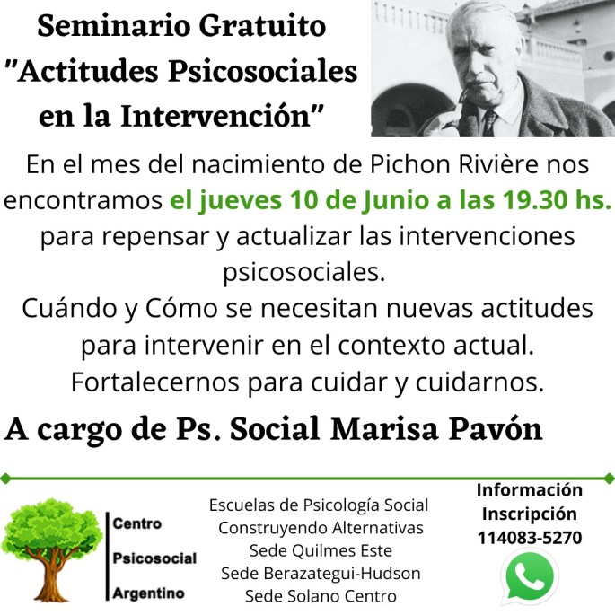 Seminario Gratuito y de Calidad. "Actitudes Psicosociales en la Intervención"Jueves 10 de Junio a las 19.30 hs. EN EL MES DE PICHON RIVIÈRE Seminario Gratuito y de Calidad. "Actitudes Psicosociales en la Intervención"Jueves 10 de Junio a las 19.30 hs. Docente Marisa Pavon GRATUITO y VIRTUAL para todos/as los Trabajadores de la Psicología Social, Estudiantes … Sigue leyendo EN EL MES DE PICHON RIVIÈRE.Seminario Gratuito y de Calidad.
