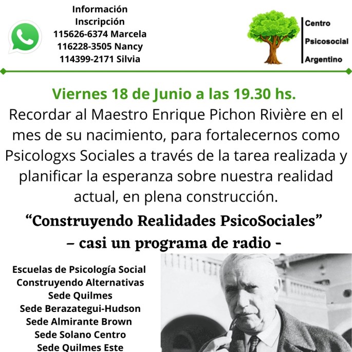 “Construyendo Realidades PsicoSociales” – casi un programa de radioEN EL MES DE PICHON RIVIÈRE Participación Espontánea de Psicologxs SocialesGRATUITO y VIRTUAL para todos/as los Trabajadores de la Psicología Social, Estudiantes y Público en General. Coordinan la actividad: Ps. Social Marcela Aiello, Ps. Social Nancy Benitez, Ps. Social Analia Canselo, Ps. Social María Itatí Gomez, Ps. … Sigue leyendo “Construyendo Realidades PsicoSociales” – casi un programa de radio EN EL MES DE PICHON RIVIÈRE