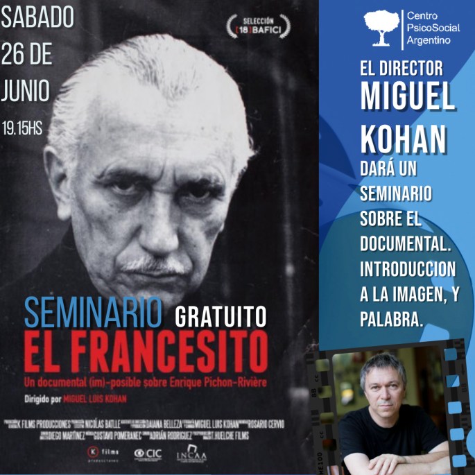 Un Regalo hermoso. Para Tod@s los Estudiantes y Trabajador@s de la Psicología Social y Salud Mental del País. El sábado 26 de junio te enviamos vía e-mail GRATIS la Película “El Francesito” (Documental sobre la Vida de Enrique Pichón Riviere) Anótate completando este formulario: https://forms.gle/vmPcJAXtMnYbfNhQ9 En forma GRATUITA, Además el Director Miguel Kohan dará un … Sigue leyendo Seminario Gratuito Virtual:EL FRANCESITO + ENVIO DE FILM GRATIS.