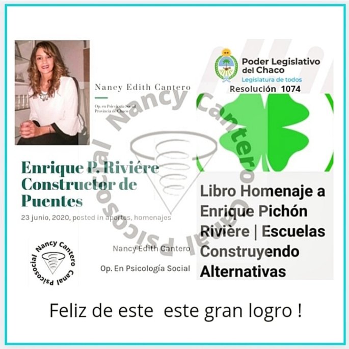 LIBRO HOMENAJE A ENRIQUE PICHON RIVIERE El Libro Homenaje a Enrique Pichon Riviere, ha sido Declarado de Interés Legislativo, Provincial y Educativo por la Cámara de Diputados del Chaco. Resolución: 1074/21. puede descargarse en forma Gratuita en: https://www.libropichon.com/ Felices por este gran logro. Gracias al querido Juan Carlos Ayala (Dip. Prov. del Chaco) y al Presidente … Sigue leyendo LIBRO HOMENAJE A ENRIQUE PICHON RIVIERE.