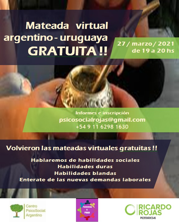 CENTRO PSICOSOCIAL ARGENTINO- CONSTRUYENDO ALTERNATIVAS MATEADA VIRTUAL GRATUITA ARGENTINA- URUGUAY☆HABILIDADES DURAS, BLANDAS Y SOCIALES☆ ● 27 de marzo- de 19 a 20 horas●- Las habilidades blandas, duras y sociales son necesarias para trabajar en el futuro, debemos resolver problemas complejos, pensar críticamente, gestionar equipos, coordinar trabajos , orientar clientes, por lo tanto, los procesos de … Sigue leyendo MATEADA VIRTUAL GRATUITA ARGENTINA- URUGUAY