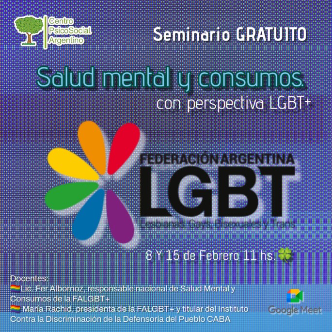 📚✨ Capacitación GRATUITA en Salud Mental y Consumos con Perspectiva LGBT+ ✨📚 Los días sábado 8 y 15 de febrero a las 11 hs, te invitamos a participar de dos jornadas formativas gratuitas y de calidad, organizadas por el Centro PsicoSocial Argentino y la Federación Argentina LGBT+, con el apoyo de la Defensoría LGBT+. 👥 … Sigue leyendo SEMINARIO GRATUITO: SALUD MENTAL Y CONSUMOS con perspectiva LGBT+