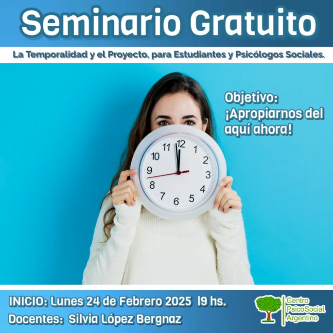 ❤ Seminario GRATUITO: La Temporalidad y el Proyecto, para Estudiantes y Psicólogos Sociales. Objetivo: Apropiarnos del aquí ahora, 🍀 INICIO: lunes 24 de febrero 2025 a las 19 has. Docente: Silvia López Bergnaz 🍀 Se Entrega Certificado Digital y material Virtual- Gratuito y de Calidad. INSCRIPCION AQUI: https://forms.gle/a9DB8ysGtEd5ezTD7 Temario 🍀 Alfredo Moffat. El Maestro. 🍀 El proyecto como planificador de esperanza. … Sigue leyendo SEMINARIO GRATUITO: La temporalidad y el Proyecto.