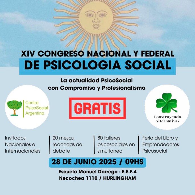 XIV CONGRESO NACIONAL Y FEDERAL DE PSICOLOGÍA SOCIAL La Actualidad Psicosocial, con Compromiso y Profesionalismo. La verdadera lucha es acá, con trabajo genuinoTod@s los Psicólog@s Sociales y Estudiantes serán bienvenidos Actividad GRATUITA – Entrada Libre y GRATUITA. 28 de Junio 2025 en HURLINGHAM Esc. Manuel Dorrego – E.E.F. 4 / Necochea 1110 Invitados Nacionales e Internacionales … Sigue leyendo XIV CONGRESO NACIONAL Y FEDERAL DE PSICOLOGIA SOCIAL.