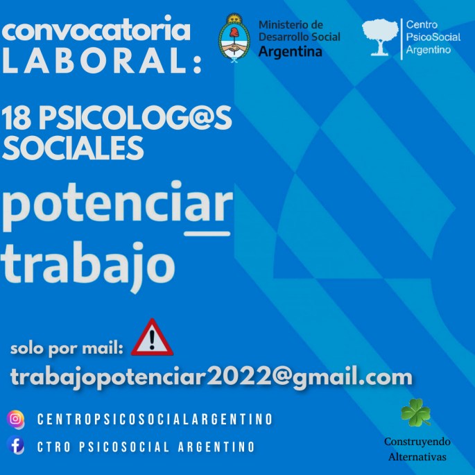 Trabajo para l@s Psicolog@s Sociales. 18 Puestos de Trabajo. Trabajo para todos/as los y las Psicólogos/as Sociales. (leer todo con atención) Se necesitan 18 Psicolog@s Sociales, Zona Norte, Sur y Oeste. Prometimos y Cumplimos, Hoy lo hacemos realidad Juntos. Atreves del Programa POTENCIAR Trabajo, Ministerio de Desarrollo Social de la Nación las Escuelas “Construyendo Alternativas” y … Sigue leyendo Convocatoria Laboral: POTENCIAR TRABAJO = 18 psicolo@s sociales.