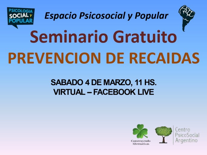 Seminario GRATUITO, Estudiantes, Psicolog@s Sociales, Personal de Salud y Público en General. Tema: PREVENCIÓN DE RECAÍDAS en los Consumos Problemáticos. Docentes: P.S. Pablo Carrillo. INICIO: Sábado 4 de marzo, 11 hs. VIRTUAL y de CALIDAD. Se Entrega Certificado Digital con número de Resolución a nivel Nacional: ANOTATE AQUÍ: https://forms.gle/vc6VVKiDTz7ev65j7 La importancia del autoconocimiento Identificación de situaciones riesgosas Refuerzo de conductas … Sigue leyendo SEMINARIO GRATUITO : PREVENCIÓN DE RECAÍDAS.