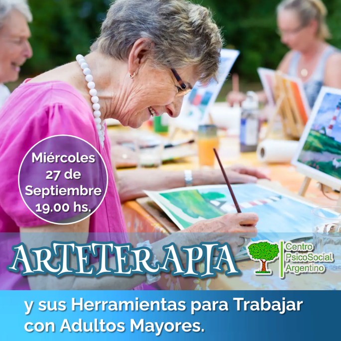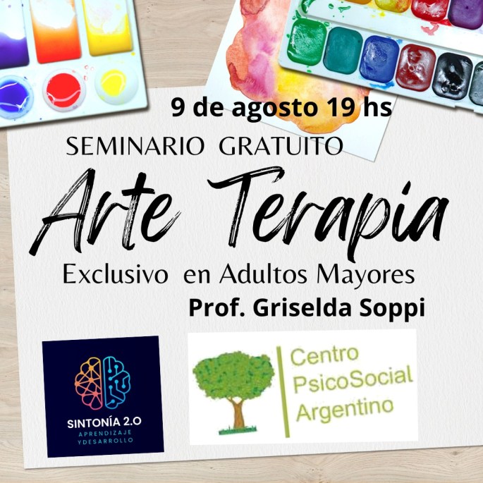 Seminario GRATUITO *Arteterapia en Adultos Mayores* Viernes 9 de Agosto 19 hs Docente: Griselda Soppi. - Psicopedagoga. Ejes temáticos del Seminario Gratuito *El Arteterapia en Adultos Mayores* * Beneficios en Demencia. * Como intervención en la rehabilitación motora y emocional * Autoconocimiento y gestión emocional en la tercera etapa de la vida. * La familia … Sigue leyendo Seminario GRATUITO: Arteterapia Exclusivo Adultos Mayores.