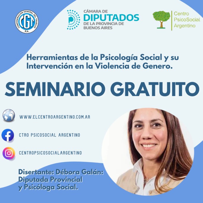 Seminario GRATUITO, Estudiantes, Psicolog@s Sociales y Público en General. “Herramientas de la Psicología Social y su Intervención en la Violencia de Genero”. Inicio: Sábado 19 a las 19 hs. Disertante: Débora Galán, Diputada Provincial y Psicóloga Social. Se Entrega certificado Digital ANOTATE AQUÍ: https://forms.gle/i3fsWLZsNYUJqYoX6 También se dará material de Estudio Gratuito Temario: Violencias y Familia. … Sigue leyendo Seminario GRATUITO.Herramientas de la Psicología Social y su Intervención en la Violencia de Genero.