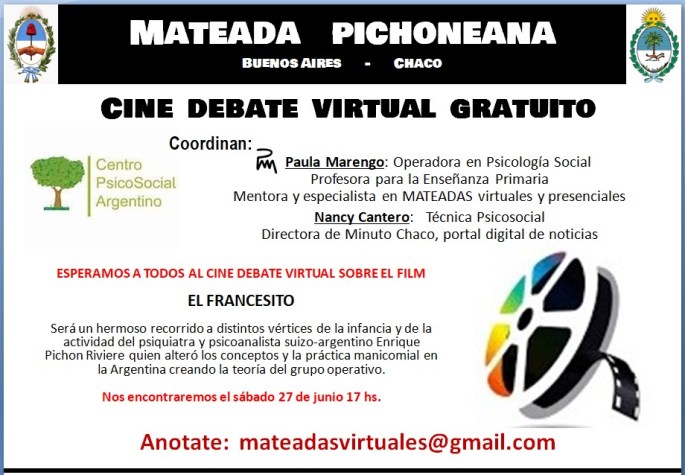 Cine debate el sábado 27 de Junio a las 17 hs de forma virtual- gratis. ❤Continuando con algunas actividades, en homenaje a quien fuera considerado el padre de la “Psicología Social” en nuestro país. Anótate: mateadapsicosocial@gmail.com 🍀 Te acercamos nuevamente, otra propuesta cultural que se va a realizar el día sábado 27 de Junio a las 17 … Sigue leyendo Cine Debate Virtual Gratuito y Mateada Bs As- Chaco.
